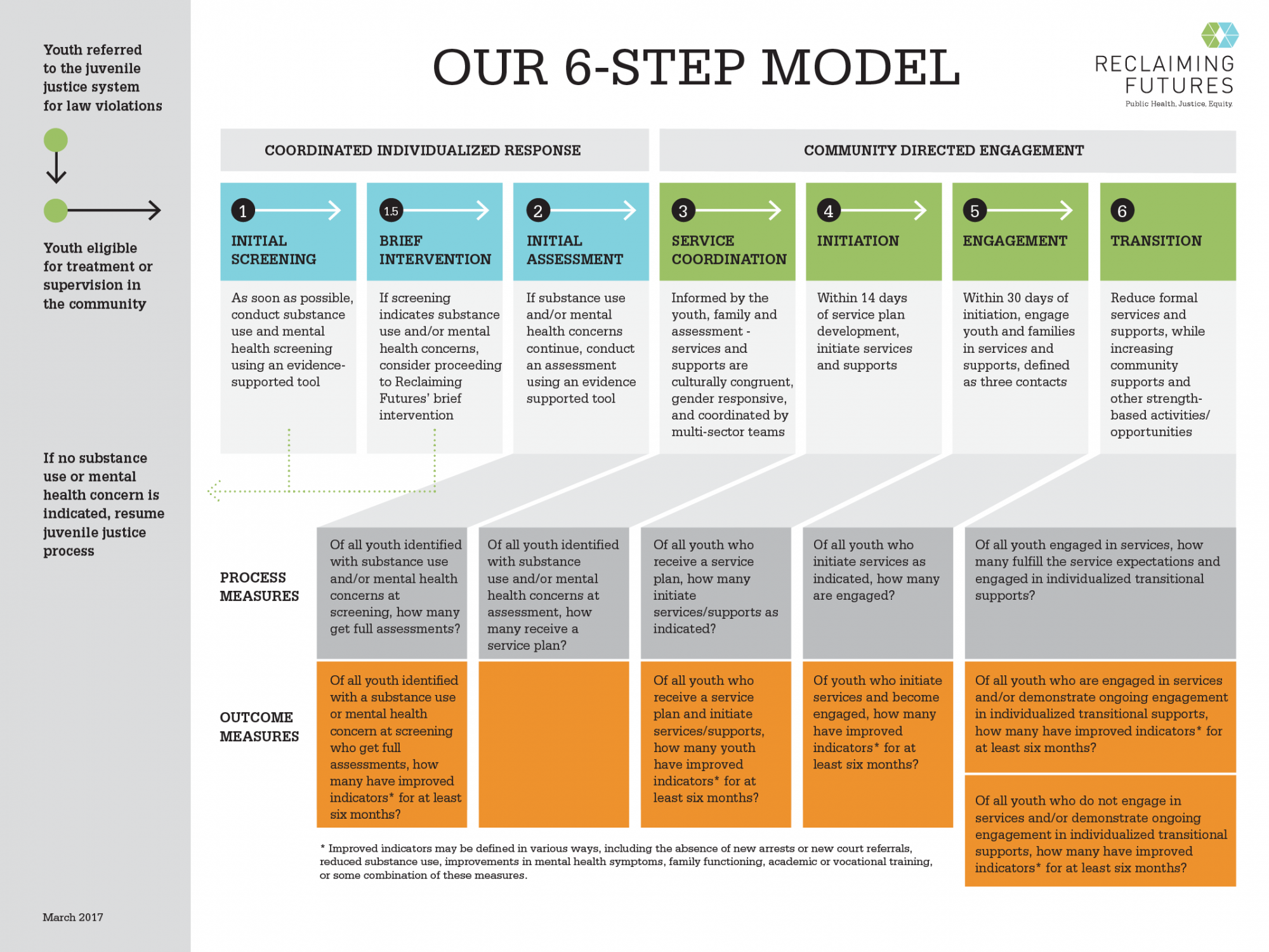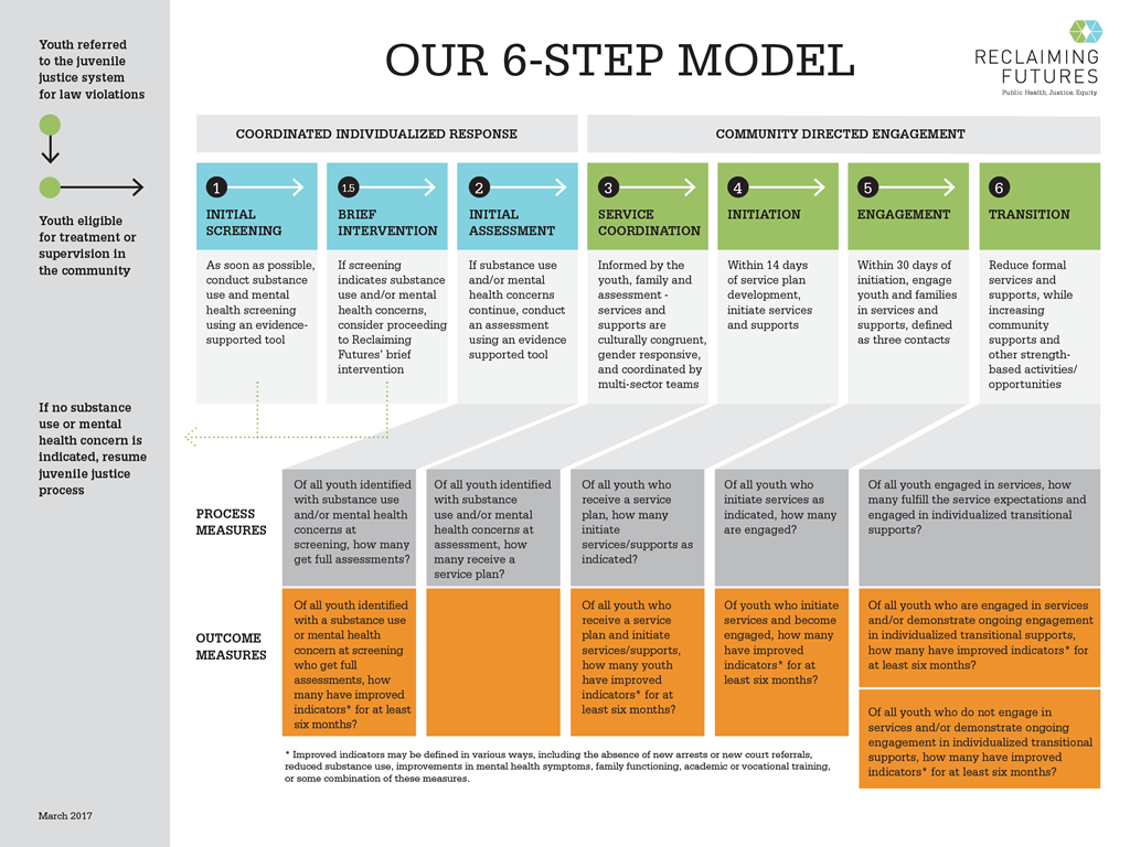 The Reclaiming Futures 6-step model provides guidance on how to identify and respond to youth and families who may have behavioral health concerns. It offers a structured approach for interacting with young people involved with the juvenile justice system. The sequencing of steps and response times (e.g. initiation with within 14 days) were developed based on best practice research and recommendations. Process and outcome measures are attached to each step, to help sites evaluate their progress. Training and technical assistance is available to help sites implement each step of the model.